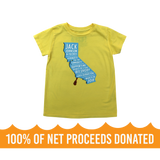 Kid's Yellow SB Bowl Benefit Tee. Made in the USA from 100% Organic cotton, printed with water based inks with custom contrast stitching. Designed in Hawaii, produced in Los Angeles.
