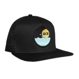 Black on black adjustable trucker hat featuring a Jack Johnson embroidered patch on the front. One size fits most!