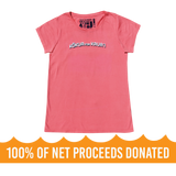 Women's Coral Kaua'i Flood Benefit Tee. Made in the USA from 100% Organic cotton, printed with water based inks with custom contrast stitching. Designed in Hawaii, produced in Los Angeles.